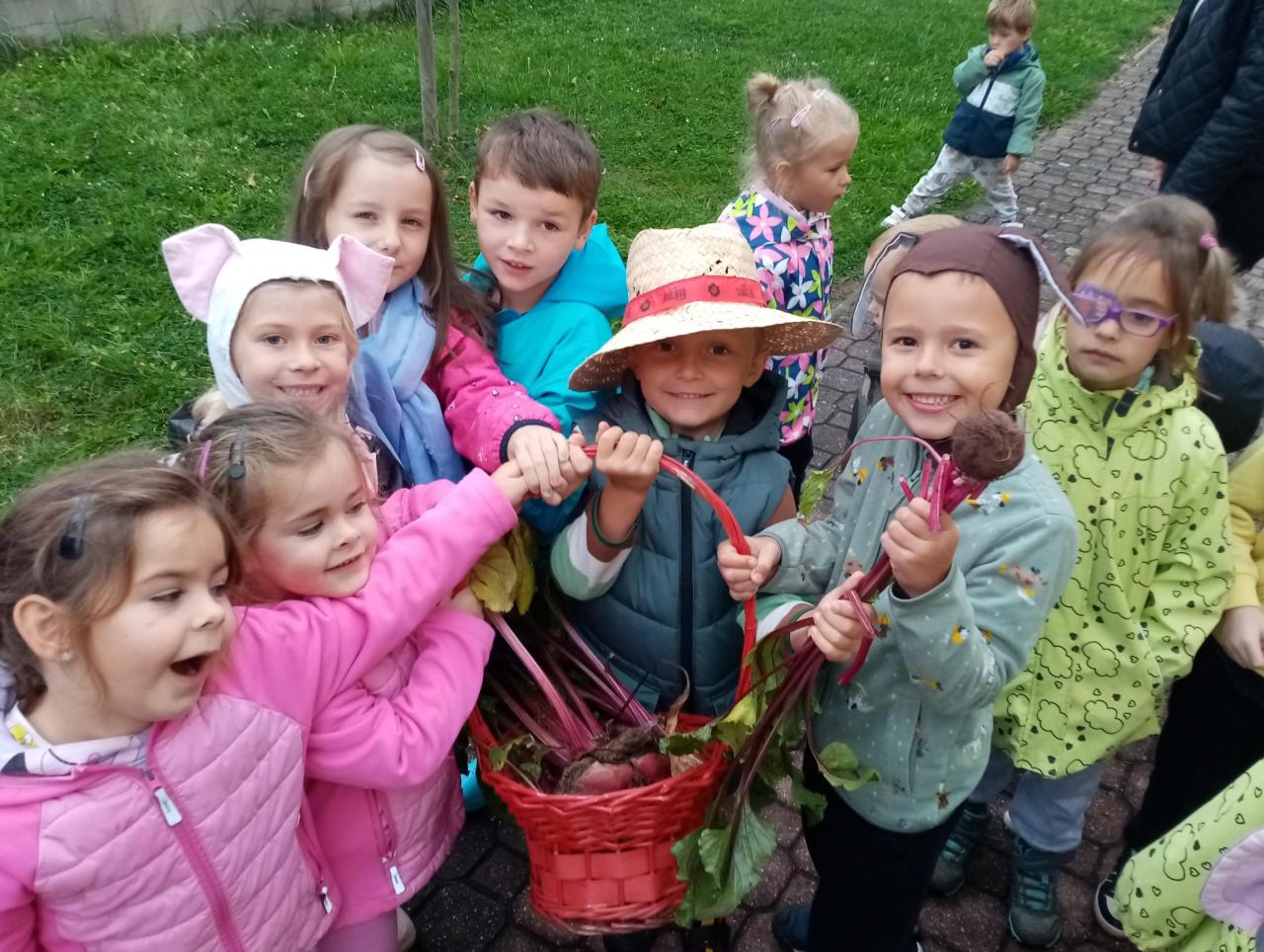 Všichni vynaložili mnoho sil, aby se nám řepa podařila vytáhnout. Společně jsme si k práci zazpívali písničku Šel zahradník do zahrady. Pro řepu si přišla paní kuchařka, která nám z ní připraví zdravou polévku. Mňam, to bude dobrota.